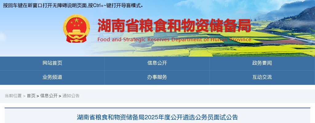 原标题:湖南省粮食和物资储备局2025年度公开遴选公务员面试公告