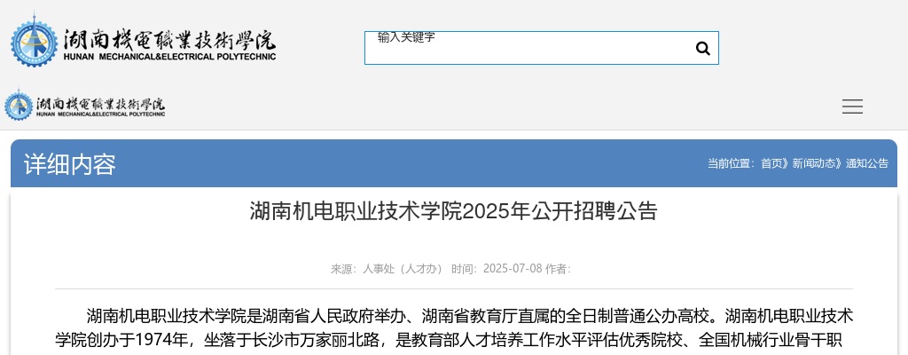 招聘信息通过湖南省人力资源和社会保障厅网站(http://rst.hunan.gov.cn/)、湖南机电职业技术学院网站面向社会公开发布。