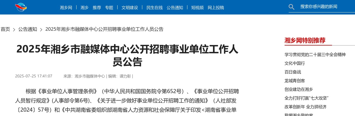 湘乡市融媒体中心2025年公开招聘事业单位工作人员计划与岗位表.xlsx 湘乡市人力资源和社会保障局 2025年7月25日 2025年湘乡市融媒体中心公开招聘事业单位工作人员网络填报信息地址:www.jobgov.com 原标题:2025年湘乡市融媒体中心公开招聘事业单位工作人员公告 文章来源:https://www.hnxxnews.com/content/14334610 【2025年湘潭湘乡市融媒体中心招聘事业单位工作人员10人公告】相关岗位: |