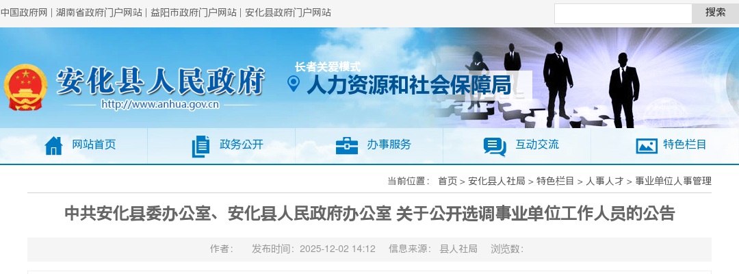 | 1.公开选调职位表 中共安化县委机构编制委员会办公室 安化县人力资源和社会保障局 中共安化县委办公室 安化县人民政府办公室 2025年12月1日 原标题:中共安化县委办公室、安化县人民政府办公室 关于公开选调事业单位工作人员的公告 文章来源:http://www.anhua.gov.cn/1408/1435/content_2132518.html