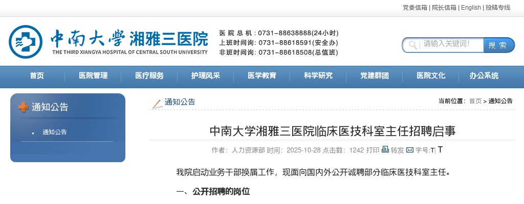 原标题:中南大学湘雅三医院临床医技科室主任招聘启事